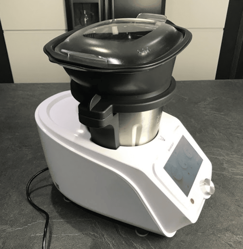 Ce robot de cuisine de Lidl a un écran couleur tactile de 7 pouces. Sa position légèrement inclinée permet une bonne lisibilité à l’utilisateur. C’est ici que vous allez régler les températures, les mixages, la vitesse de cuisson ainsi que les autres commandes.